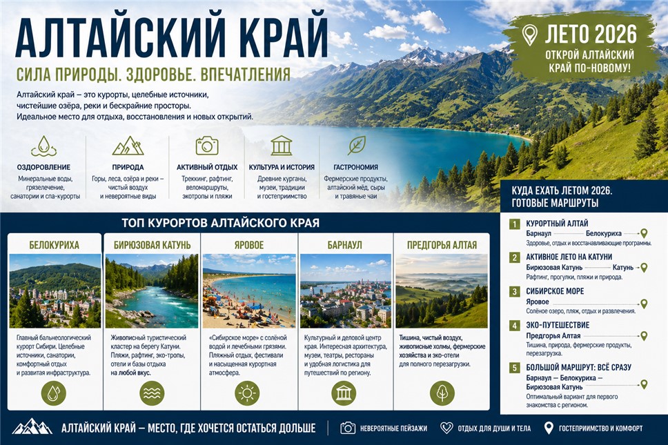 Алтайский край сегодня — это один из самых многогранных туристических регионов России, где сочетаются мягкий климат, уникальная природа и разнообразие форм отдыха. В отличие от более «экстремального» Горного Алтая, здесь путешествие становится более доступным, комфортным и при этом не менее насыщенным.