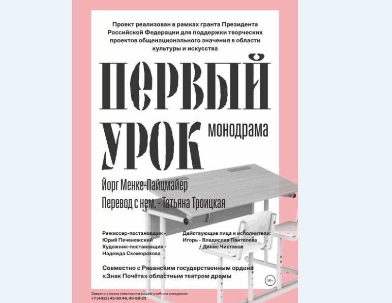 12 октября 2022 года в 15.00 на малой сцене Рязанского театра драмы состоится показ монодрамы "Первый урок" немецкого автора Йорга Менке-Пайцмайера для зрителей 12+. Проблематика спектакля соответствует этому возрасту.
