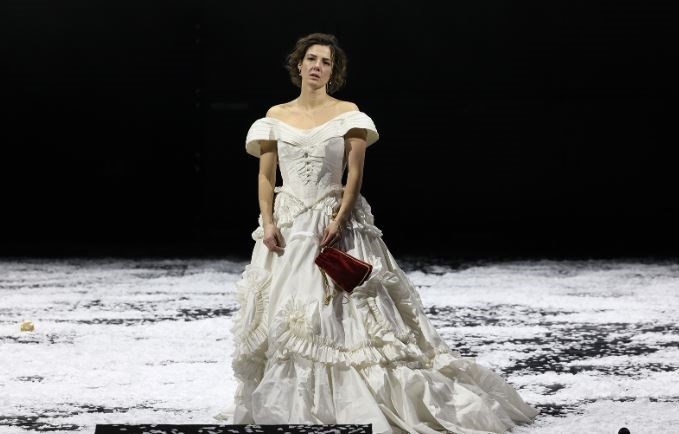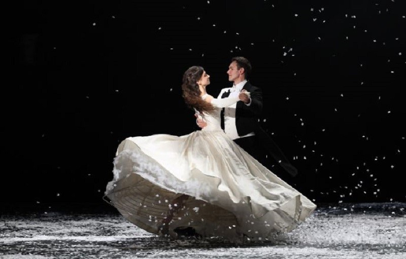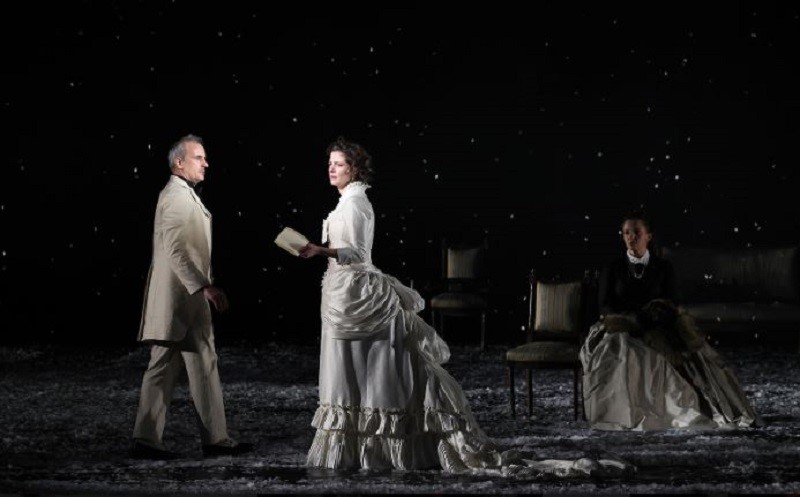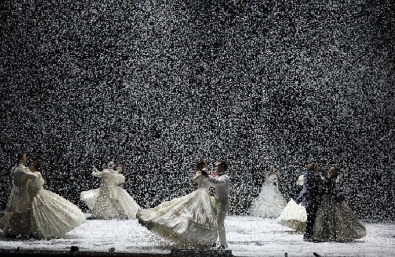 Ну и конечно – спектакль очень эффектен. Все сказанное выше приходит на ум потом, а с самого начала до конца трехчасового с лишним действия и простой зритель, и обозреватель сидят, что называется, с открытыми ртами. Огромная сцена театра практически пуста, отчего кажется какой-то необозримой. И над ней постоянно идет снег. Ловкая и масштабная театральная инженерия позволяет режиссеру вывести все действие как будто в открытое поле, где то падает легкий снежок, то разыгрывается настоящий буран, в котором почти не видно действующих лиц. И как забудешь яркий финал спектакля – Анна в самом прямом смысле исчезает в жестоком буране!