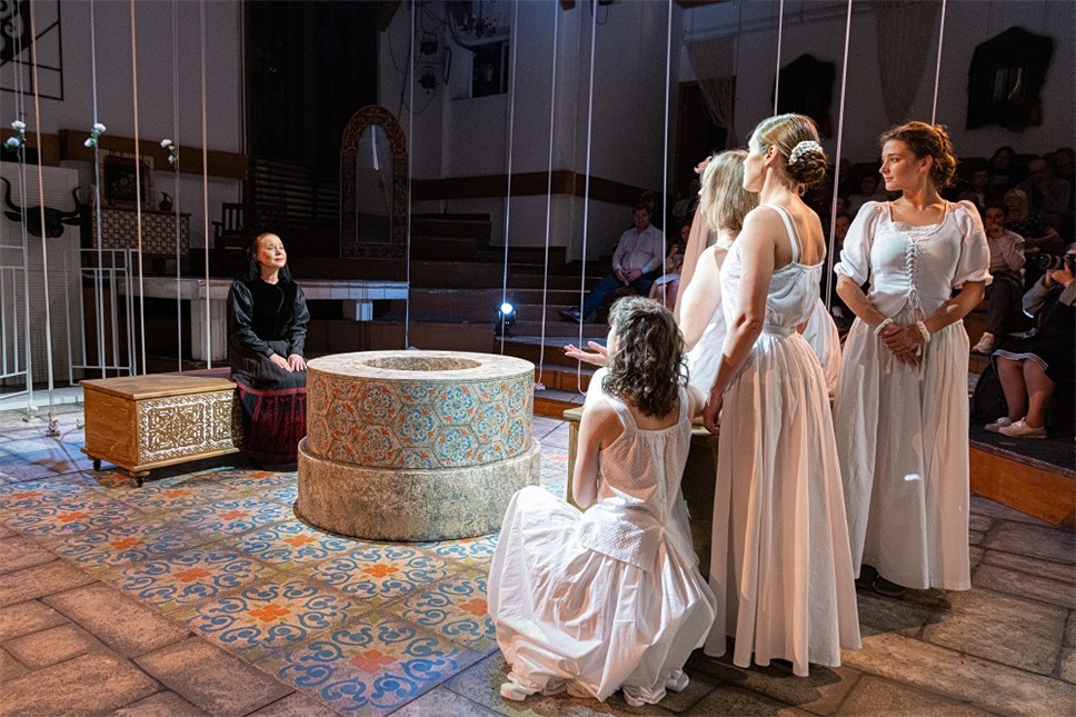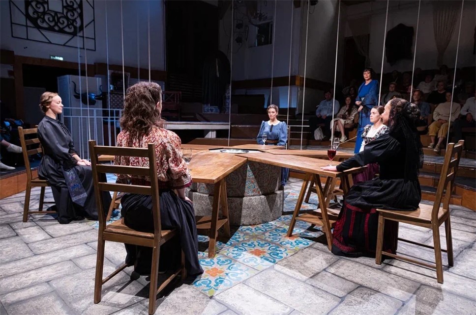 В постановке Ивана Рубцова антиклерикальная тема едва намечена. Однако сложно не услышать, что трагедия разворачивается под звуки неземных католических песнопений. Символически Dome (одна из конструкций христианского храма) смыкается с жестоким домом Бернарды, где сохнут от зноя свежие ростки: цвет платья, в который переодевается Адела после похорон отца, отметим ещё раз, зеленый. Елена Маркелова подчеркивает экзальтированность и нервную восприимчивость девушки: ее звенящим, как струна, голосом Адела упоминает терновый венец, надеваемый "во имя любви". Сделает ли он самоубийцу ближе ко Христу, чем селян, дружными рядами ведущих на казнь жертву придуманных людьми условностей? Богу видней. Но точно одно: Христа нет и близко там, где считают, что можно полюбить или разлюбить по указке, забеременеть и родить (или не родить), согласно ГОСТу.