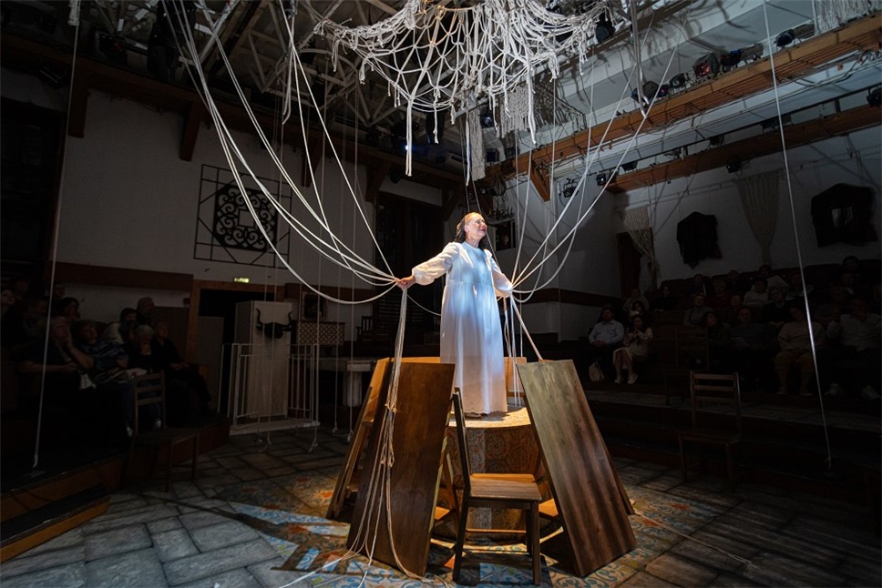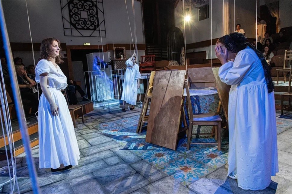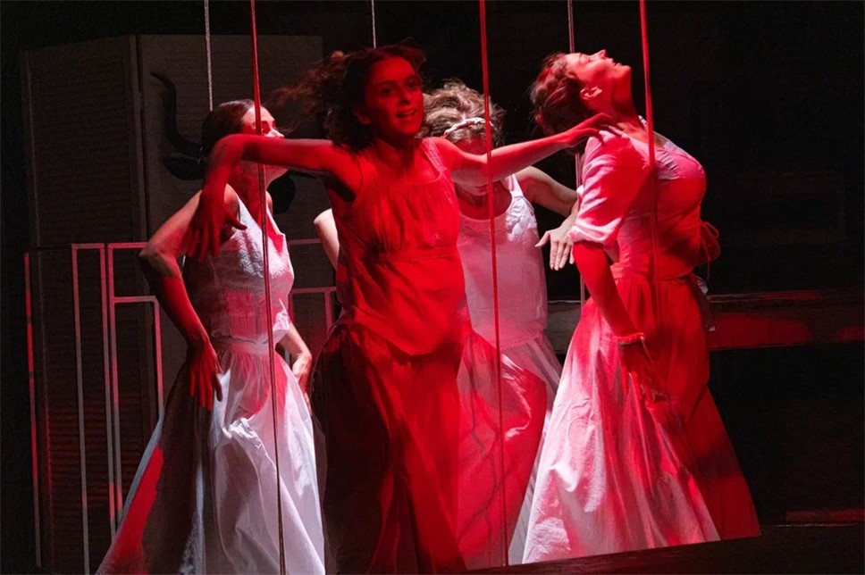От финала к завязке тянется, таким образом, нить-верёвочка: в финале становится понятной идея подобного оформления сцены. Дом окутан сеткой из белых нитей, символически напоминающих и паутину, из которой невозможно выбраться, и нити, на которых болтаются марионетки (неслучайно с участием этих белых веревок организованы все динамичные, все танцевальные эпизоды). А ещё они похожи на пуповину, случается, удушающую младенцев. Дом, этот древний, как мир, символ защиты от внешних угроз, в патриархальном обществе превращается не просто в тюрьму, а во вместилище смерти, матку-убийцу. Внутри него наряжающие Ангустиас к свадьбе сестры двигаются в белых одеждах, похожих на саваны. В белый цвет требует убрать дом Бернарда, узнав о самоубийстве Аделы. Белый цвет – цвет чистоты, в том смысле, в котором она означает отсутствие, нечто не случившееся или уже завершенное, не существующее, выпавшее из бытия. На сцене он символизирует непрожитые жизни Ангустиас, Магдалены, Амелии и Мартирио. В финальной сцене дочь и мать остаются вдвоем, и мы вновь видим Аделу танцующей в зелёном платье, в котором она начала свой бунт. Антитеза белого и зелёного как в пьесе, так и в театральной постановке визуально проявляет конфликт небытия и воли к бытию, воли быть субъектом, делать выбор.