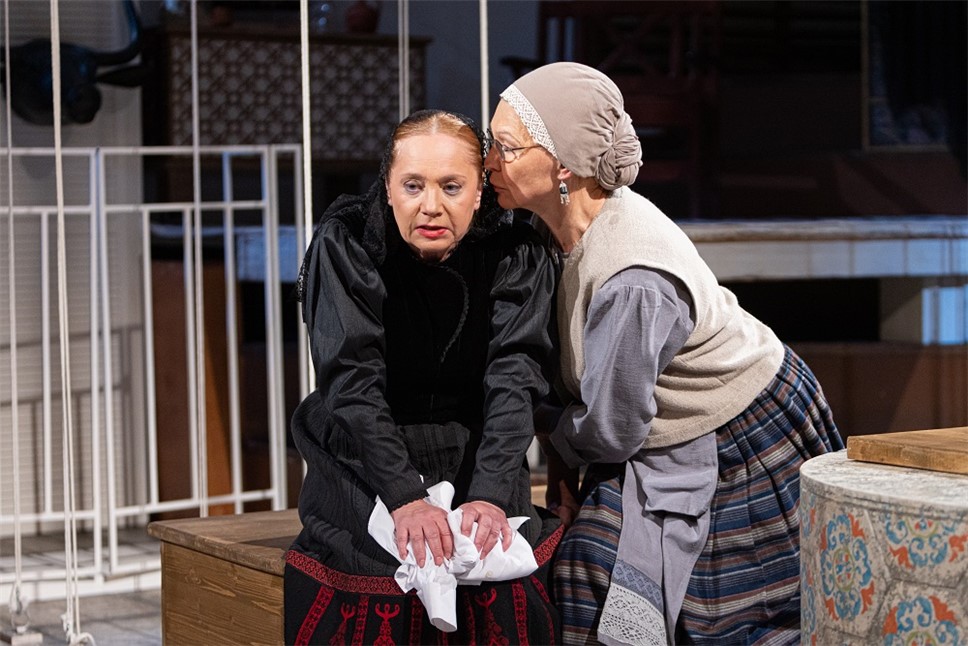 Семейный микросоциум изображен как продолжение сельских нравов. Он токсичный, блокированная энергия молодых тел перерождается во взаимную агрессию. Образы сестер воплотили Нелли Шмелева, Екатерина Богданова, Дарья Савичева, Евгения Казарина и Елена Маркелова. Все сестры похожи в одном: чем более обделенными мужским вниманием чувствуют себя женщины, тем больше они ненавидят друг друга. Таков социальный контекст, в котором Бернарда Альба в финале стреляет в Пепе, чтобы защитить не дочь, а "честь дома". Адела думает, что ее любовник убит. Как всегда экспрессивная, Татьяна Филатова властно, с надрывом требует: все, все должны знать, что ее дочь умерла девственницей! Это единственное, что ее волнует, когда труп дочери качается в петле...