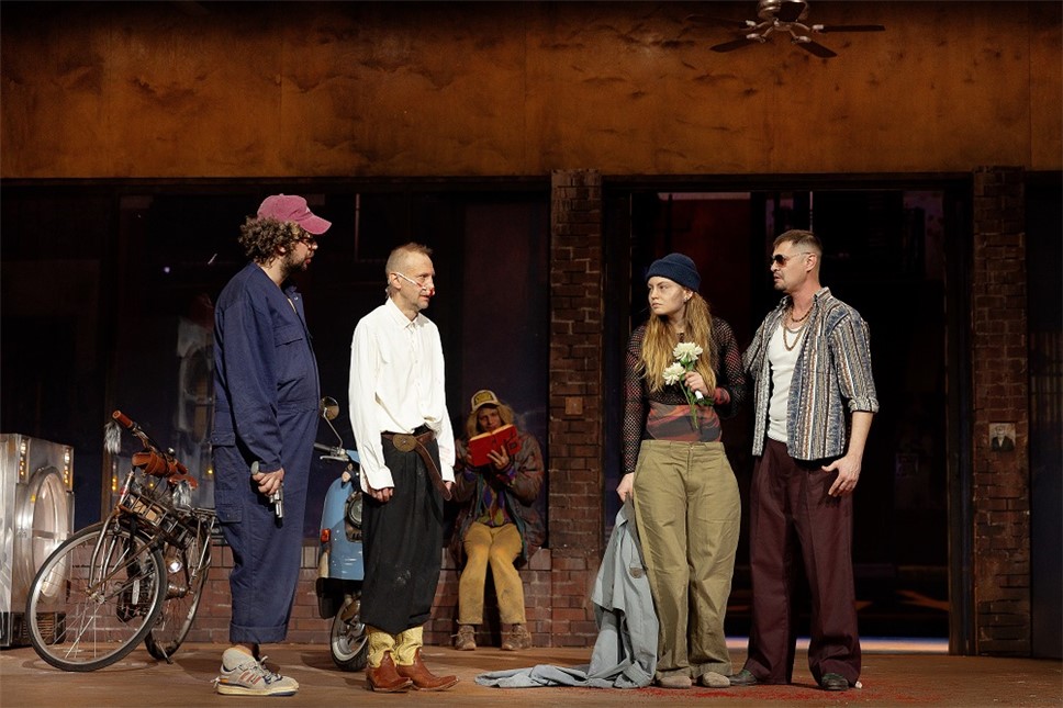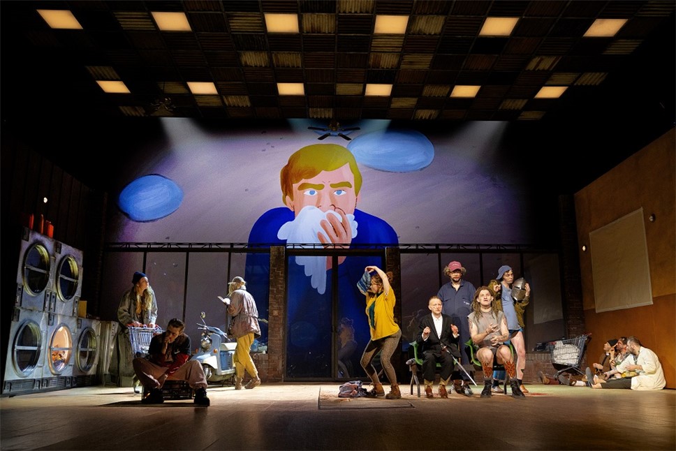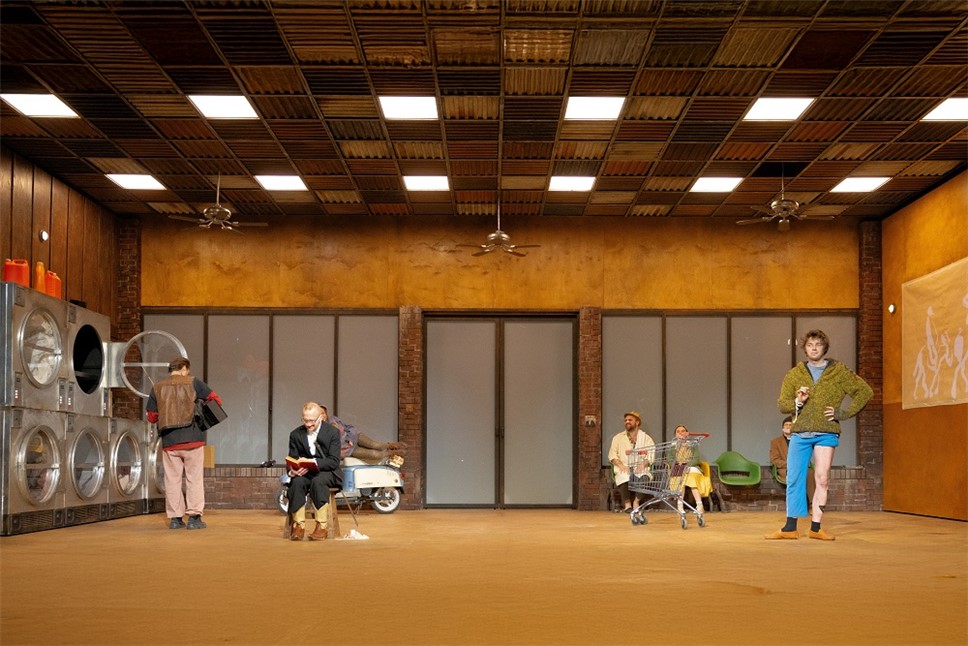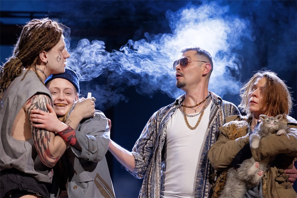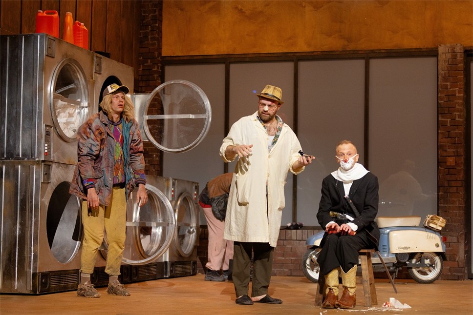 Кстати, сцена разделена на две части. Авансцена – та самая прачечная, дальше стена с большими окнами – а затем гигантский экран, на котором показывается либо улица в городе, либо картинки с горами, либо просто мультики. И в данной концепции эта стена является своеобразной границей между героем и его наркотрипами. И герой мечется между этими двумя мирами, будучи чужим и там, и тут. То есть чужой и в реальном мире, и в выдуманном. Так увидел я.