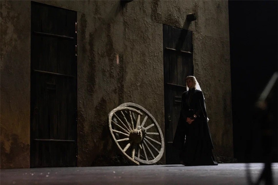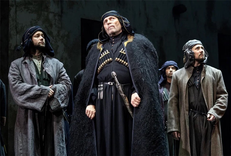 Тут кстати и рама этому демонизму — глухие стены как барьер между добром и злом. Как ни странно, Кончаловский углядел родство между шотландскими и кавказскими замками. И дело тут не только в архитектуре и больших кувшинах, а в принципе сценографии, которая достаточно аскетична. Нет пышных декораций, акцент сделан на символических деталях. Действие происходит во дворе: две глухие стены, в которых четыре двери. И они регулярно оказываются заперты перед героями, что тоже весьма символично. Световые контрасты (художник по свету — Нарек Туманян) также подчёркивают дуализм добра и зла. А пластические решения, придуманные хореографом Рамуне Ходоркайте, превращают массовые сцены в ритуальные действа — то ли безумный танец с саблями, то ли мистическое шаманство...
