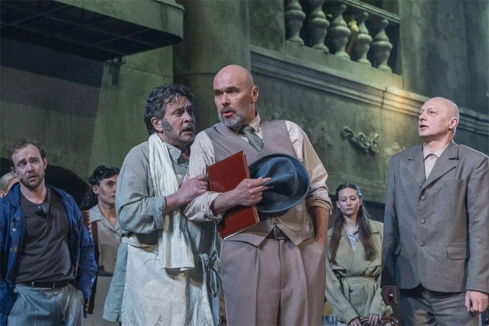 Актеры становились словно бы единым целым с гигантскими декорациями, окуная в этот массовый водоворот главных героев спектакля.