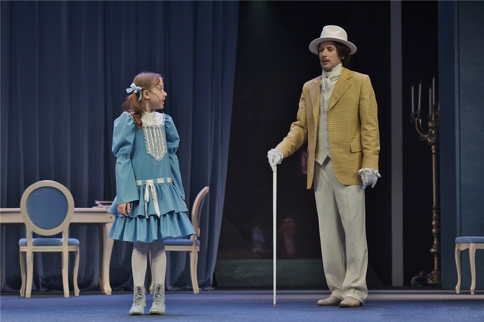Замечательный, опытнейший театральный художник Стефания Граурогкайте давно сотрудничает с акимовским театром. Историю про господина Альфонса она оформила с филигранным изяществом, применив «говорящие» цвета и выразительные смысловые оттенки. Сдержанный пыльно-голубой превалирует, мягкий кремово-белый служит окантовкой декорации и малочисленных, чисто функциональных предметов мебели и реквизита. Умеренность и аккуратность обстановки дома состоятельного господина де Монтеглена (непривычно сдержанный, академично деликатный Николай Смирнов) рифмуется с его терпеливым характером и мудростью, но при всей доброте душевной демонстрирует внутреннюю силу настоящего мужчины, защитника и покровителя. Он — наш герой. Он с непоколебимой решимостью и непробиваемым спокойствием становится надеждой и опорой и супруге своей Раймонде (трепетная, импульсивная Анастасия Бородихина), и дочери ее Адриенне (очаровательная, непосредственная Настя Сайко). Он обеим заменяет заботливого отца и становится другом и покровителем. Потому что умеет и готов понять, простить, принять. И потому что для него любовь — это поступки.