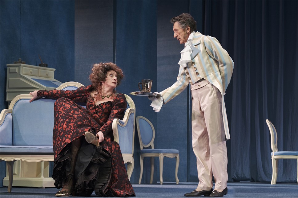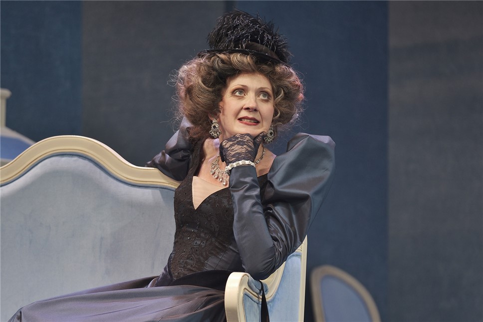 Во втором действии, впрочем, Гишар-Мелешкова существует более камерно, оправдывая изменения — и свои собственные, и ситуационные. Она успокаивается, расслабляется, принимается за добрые дела (сама сирота, решает помочь девочке-сироте) и как-то даже расцветает внешне. Теперь на ней изящное сапфировое платье и подобающие статусу бриллианты, и она почти справляется с умением их должным образом носить, и движется плавнее, и разговаривает гораздо тише, и взбрыкивает все реже.