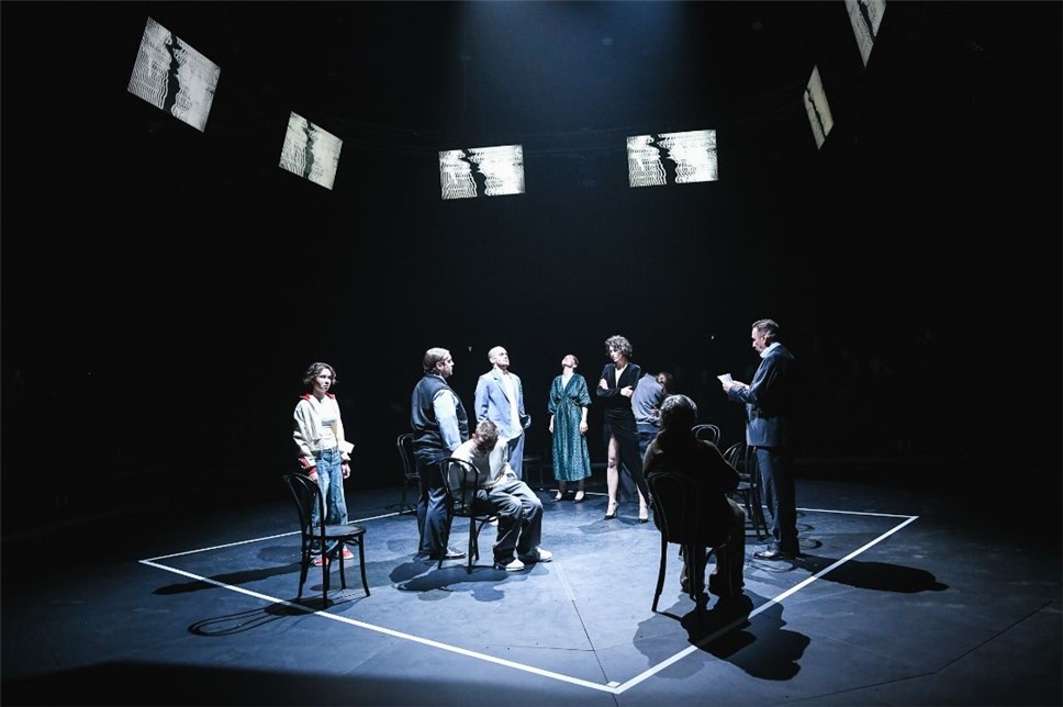 Декораций на сцене нет. Главным элементом дизайна является круг в центре сцены, который медленно вращается на протяжении спектакля. На круге — стулья. Вот и все.