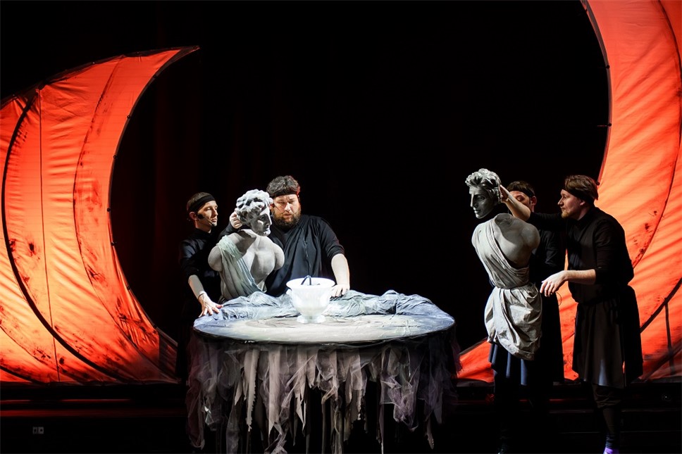 - Мне хотелось создать серьезные и красивые образы без карикатурности, без нарочито-никчемного гротеска, без дешёвого "заигрывания" со зрителем, а, напротив, с той долей таинства и мистики, которая пронизывает истории Древней Греции насквозь и заставляет задуматься: в чем истина, в чем красота и мудрость этих зачастую печальных повествований, в которых мы невольно отчасти узнаем себя, – говорит Тимур Гуляев. – Декорации не буквально воспроизводят обстановку древнего мира, где место действия меняется так часто, что не успеваешь следить за перемещениями. Отсюда обобщенно-ассоциативный ряд "воспоминаний". Плоская земля, на которой боги играют людьми, как фишками в настольной игре.