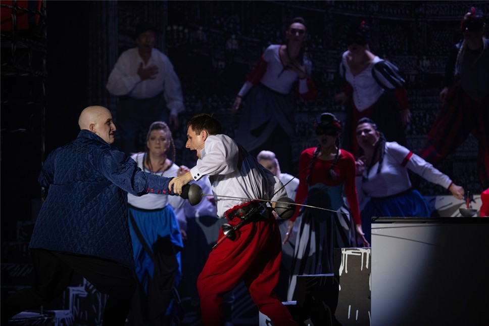 Под стать этому пиршеству страстей звучит и музыкальное оформление спектакля. К слову, музыкальное оформление было "расширено" относительно собственно представления. Традиция Рязанского музыкального театра – живая музыка в фойе перед началом спектакля. Во время пресс-показа были приглашены играть преподаватель рязанской музыкальной школы номер 1 по классу гитары Галина Гришунова и ее ученица Элина Панчук. Дамы… настроили свои гитары как лютни, чтобы воспроизвести мелодии эпохи Ренессанса. Оказывается, специалисту это не так сложно сделать путем перестройки третьей струны. В такой старинной аранжировке "лютневый дуэт" исполнил средневековые английские композиции "Зеленые рукава", "Эхо" и другие. Так зрителя "погружали" во время действия "Сирано де Бержерака" еще до входа в зал. Однако лирические трели "лютней" несколько диссонировали с почти сквозной бравурной оркестровкой мюзикла. Да и музыки в нем звучало, на мой взгляд, больше, чем речитатива, действующие лица пели заметно больше, чем разговаривали. Вероятно, это тоже символичная отсылка к неумирающему Искусству. Дирижёр-постановщик мюзикла – Сергей Кисс.