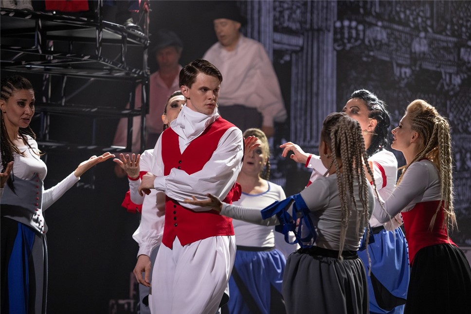Некоторый "трансформер" скрыт и в актерском составе. У некоторых ролей предусмотрено по два исполнителя. Это сам Сирано – Даниил Казаков, Кирилл Егоров, Кристиан – Даниил Степанов, Владислав Кураксин, граф де Гиш – Алексей Исаев, Игорь Шумаев. В предпремьерном показе был задействован первый состав. По мне, все они хорошо попадают в ожидаемые образы: невысокий и длинноносый задира де Бержерак, долговязый благообразный Кристиан, напыщенный вельможа де Гиш. Надеюсь, и второй состав демонстрирует единство формы и содержания. Остальные роли "закреплены" за одним и тем же кастингом: Роксана – Полина Спиридонова, Ле Бре – Антон Свиркин, Линьер – Глеб Домбровский, Дуэнья – Ирина Волкова, Де Вальвер – Максим Ситкин, монах – Сергей Куликов, Монфлери – Антон Дикарев. Спектакль "многолюдный", но основную драматическую нагрузку несут на плечах четыре-пять центральных героя, а прочие отображают не столько людей, сколько страсти и настроение. Настроение то лиричное, то бравурное, то ироничное – только не ровное и тихое; накал эмоций не дает зрителям расслабиться.