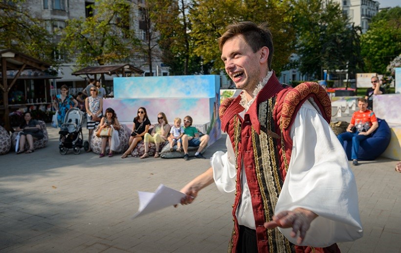 – Да, это рискованно, все будет зависеть от погоды. Но если участники не соберутся завтра на репетицию, у нас есть актеры – заменим. Нам всего-то нужно набрать шесть-семь артистов. Конечно, получится не полноценный спектакль, а скетч, набросок. Но у людей ведь есть фантазия – дофантазируют детали. До этого весь месяц мы проводили открытые репетиции – просто раздавали всем желающим сценарии и устраивали читку – и народ собирался, едва хватало мест, как в настоящем "Глобусе".
