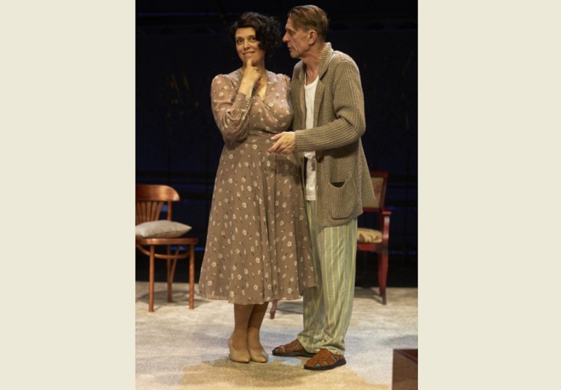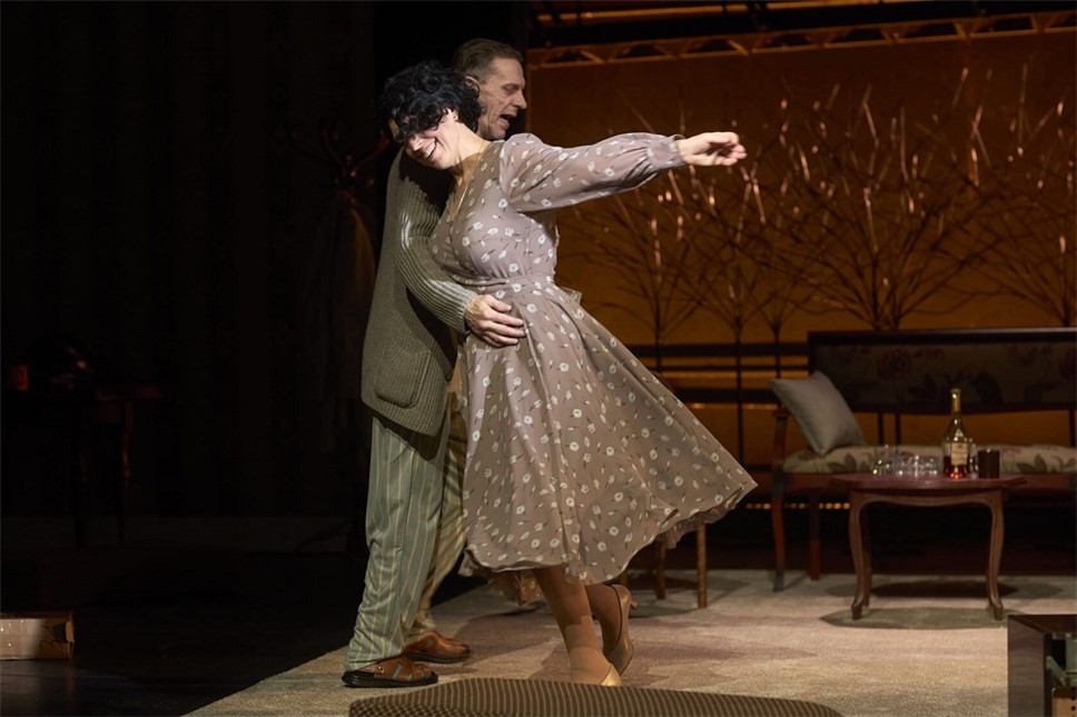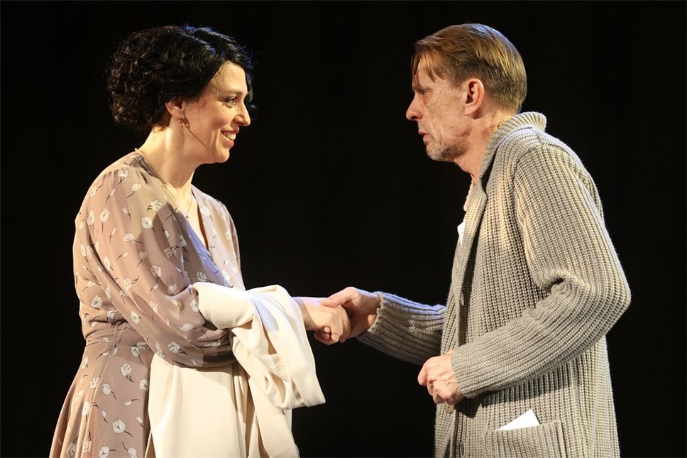 А Нелли Уварова в платье из "Красотки" сразу "дает звезду", миллионершу, которая здесь проездом. Она капризна и нелепо мечется по квартире, хватая то одну, то другую вещь... Это сначала возмущает героя (да и нас тоже), но потом он начинает видеть в ее взбалмошном женском характере и плюсы. Одинокие люди начнут не только делиться былыми победами и поражениями, но и строить планы на дальнейшую совместную жизнь. Причем под активное распитие алкоголя в течение всего спектакля, что, скажем прямо, выглядит несколько фантастично, учитывая возраст героя.
