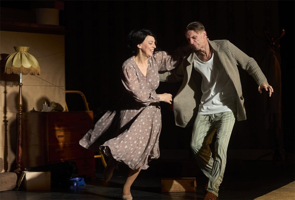 ...На экране в глубине сцены задорно подмигивает черно-белая Мэрилин Монро из культового "В джазе только девушки". Намек поняли? Гарри Бендинеру (его играет Алексей Шевченков) в кресле, в обнимку с виски, таблетками и пледом, остается только вздыхать и мечтать. У него все в прошлом: он давно потерял семью. Поэтому его новая соседка вдова Этель (Нелли Уварова) воспринимается им как подарок с неба.
