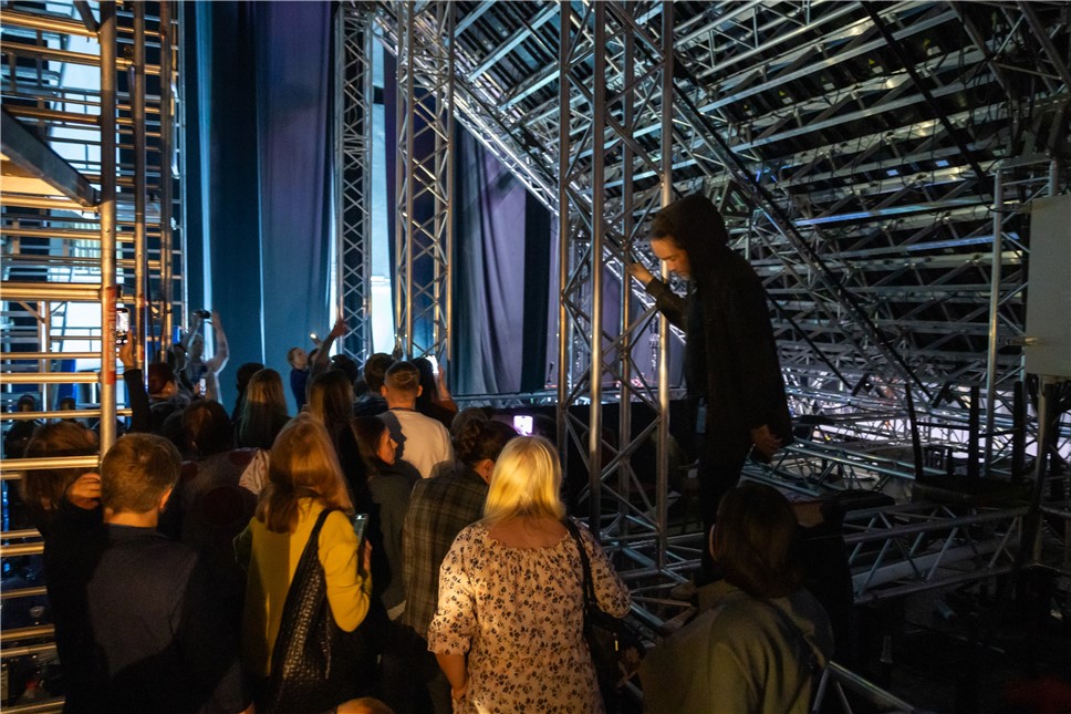 Если прежде ошеломлённый зритель мог насладиться исключительно шоу, озадачившись вопросом "а как это они всё делают", то теперь можно будет узнать, как устроен проект изнутри, посетив при желании экскурсию после спектакля. Ревизор.ru побывал за кулисами пространства "Антигравитация", немного полетал на уникальном батуте, установленном на сцене, даже вскарабкался на поверхность мультимедийного экрана. Важно, что экран - уникальная российская разработка - предмет гордости команды. Эта восьмитонная подвесная система выдерживает до 50 артистов благодаря динамическому распределению нагрузки от ударов и сотрясений. А гигантские рёбра этой мегаконструкции изумляют готической величавостью.
