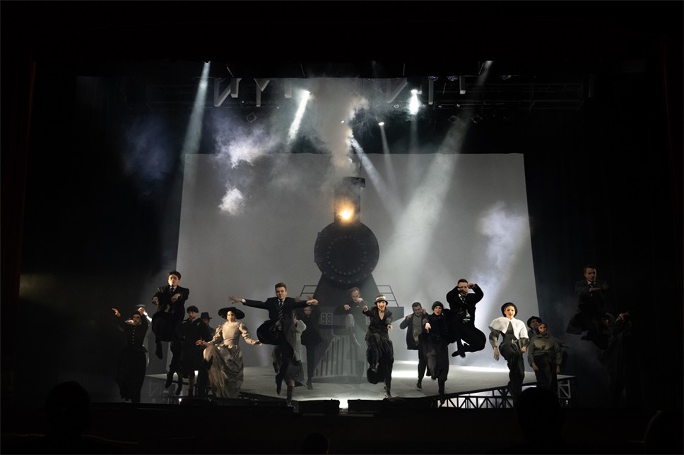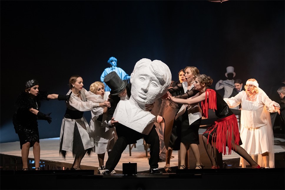 В спектакле занята вся труппа: толпы поэтов, женщин, чекистов и журналистов практически не покидают сценическое пространство, массовые сцены сменяют одна другую, летает самолет, выезжает паровоз, догоняют друг друга автомобили…