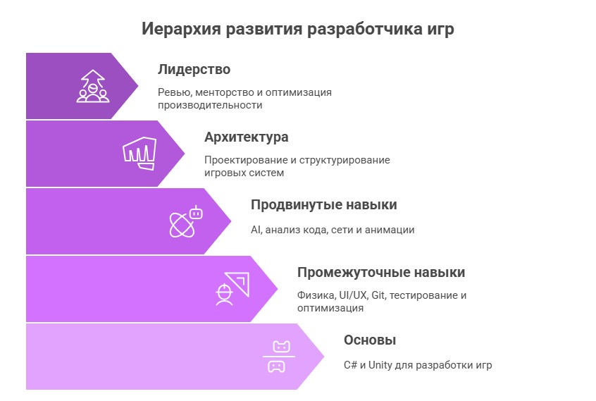 Освойте Unity для быстрых прототипов и Unreal Engine для сложных проектов. Добавьте C++ для производительности и Git для командной работы.
