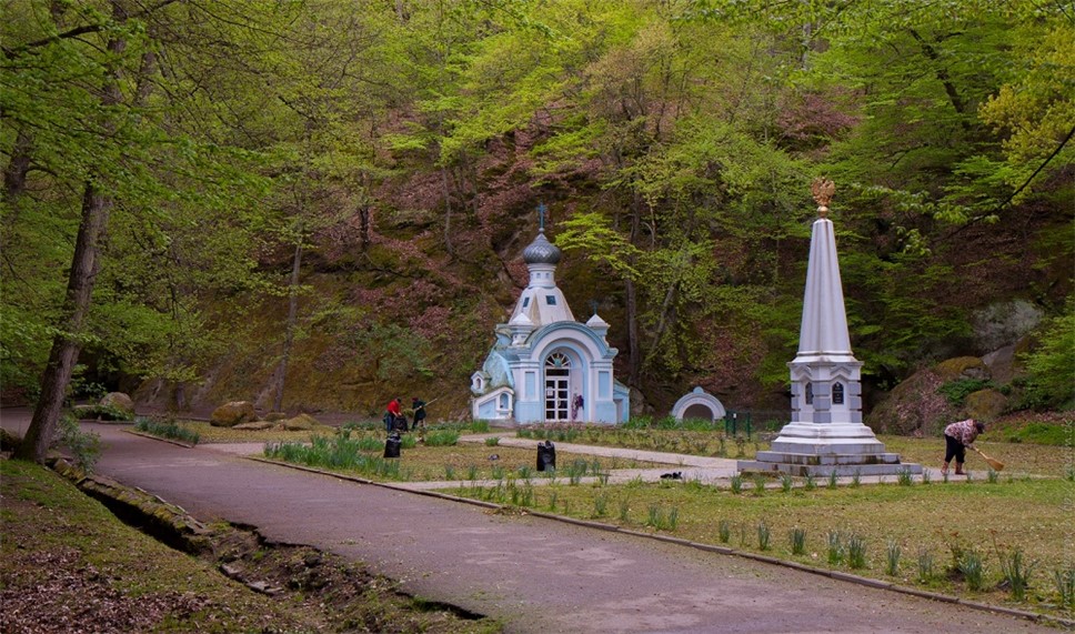 Иверская часовня, XIX в., а также монумент основателям курорта. Фото: Vadim Tolbatov, Wikimedia Commons, CC BY-SA 3.0