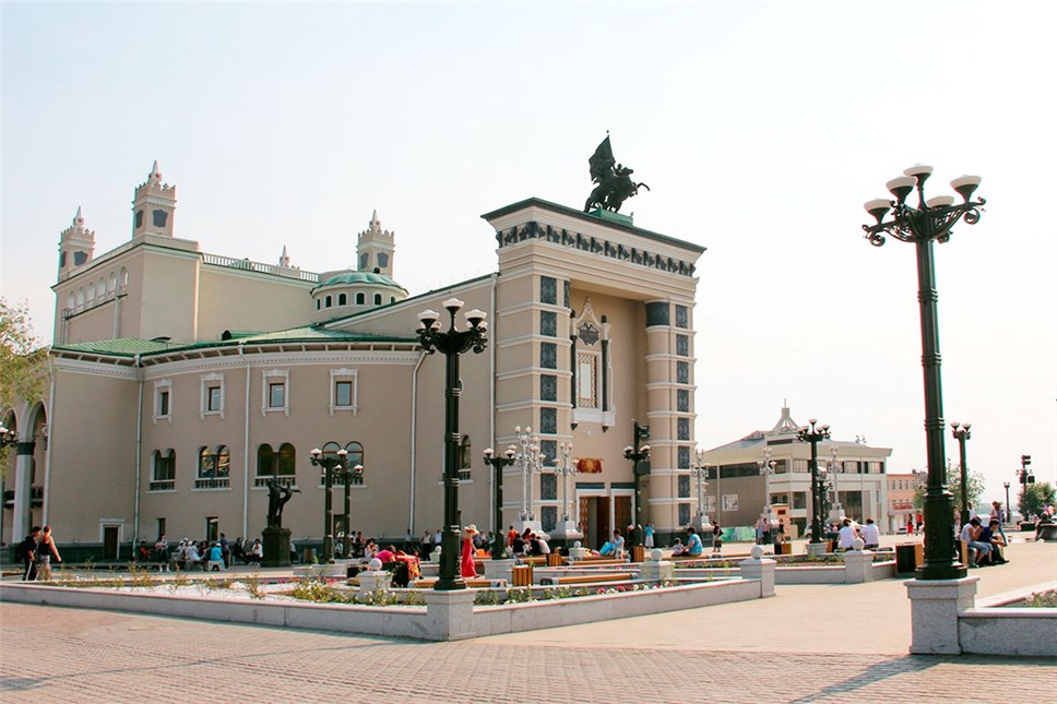 Строительство здания началось еще в 1938 году, но из-за войны работы прекратились. В итоге своих первый посетителей театр принял только в 1952 году. Архитектурный стиль – сталинский ампир – типичен для публичных зданий того времени. Выступы лоджий, кулуары в форме кольца, башенки, парадный вход, напоминающий колоннами Триумфальную арку, и элементы национального декора создают удивительную композицию, от которой трудно отвести взгляд. Над центральным входом возвышаются бронзовые статуи всадников – мужчины и женщины, скачущих рядом со знаменем в руках. Театр находится по адресу улица Ленина, 51, рядом остановка транспорта "Площадь Советов".