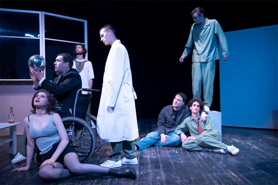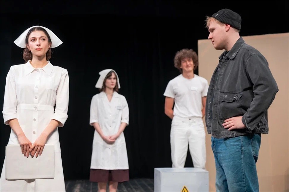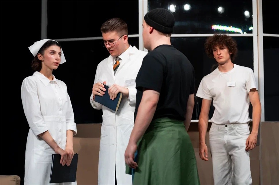 Начало спектакля достаточно невнятное. И в этом вина, разумеется, не ребят, а режиссера. Если перед студентами ставится задача сыграть психически больных людей, то надо бы им рассказать о том, какие у этих героев диагнозы (тем более, что у Кена Кизи они названы), потом дать им почитать учебники по психиатрии, чтобы студенты узнали о том, какие признаки у этих болезней, как ведут себя больные. Тогда сложились бы образы. Противоречивые, но честные.